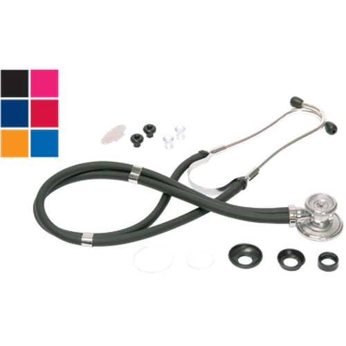 Features a double-tube configuration for improved stereo separation as well as a patented chestpiece valve stem which delivers outstanding acoustics. An accessory kit contains five interchangeable chestpiece fittings - an adult and pediatric diaphragm, and three bells (1 1/4”, 1”, 3/4”), deluxe eartips, and a chestpiece key. 22” tubing length. Five year warranty. Latex-free.